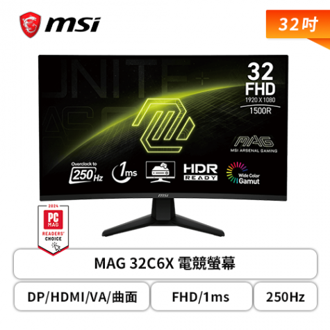 【32型】MSI MAG 32C6X 電競螢幕 (DP/HDMI/VA/曲面/FHD/1ms/250Hz/Adaptive sync/HDR/無喇叭/三年保固)