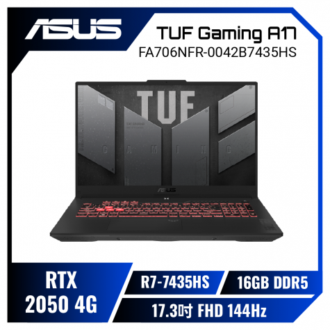 強效AMD★RTX2050 ASUS TUF Gaming A17 FA706NFR-0042B7435HS 石墨黑 華碩軍規電競筆電/R7-7435HS/RTX2050 4G/16GB DDR5/512G PCIe/17.3吋 FHD 144Hz/W11/含TUF電競滑鼠