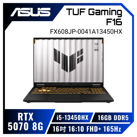超頻HX處理器★RTX5070 ASUS TUF Gaming F16 FX608JP-0041A13450HX 御鐵灰 華碩13代軍規電競筆電/i5-13450HX/RTX5070 8G/16GB DDR5/512GB PCIe/16吋 16:10 FHD+ 165Hz/W11/含TUF電競滑鼠