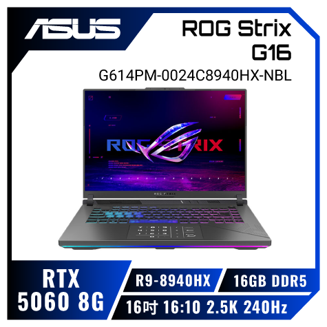 超頻R9處理器★滿血RTX5060 ASUS ROG Strix G16 G614PM-0024C8940HX-NBL 幻潮黑 華碩經典潮流電競筆電/R9-8940HX/RTX5060 8G/16GB DDR5/1TB PCIe/16吋 16:10 2.5K 240Hz/W11/含ROG後背包及電競滑鼠