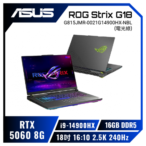 14代i9處理器★RTX5060 ASUS ROG Strix G18 G815JMR-0021G14900HX-NBL 電光綠 華碩旗艦滿血版電競筆電/i9-14900HX/RTX5060 8G/16GB DDR5/1TB PCIe/18吋 16:10 2.5K 240Hz/W11/含ROG後背包及電競滑鼠