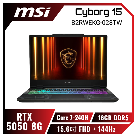 新一代高效處理器★RTX5050 MSI Cyborg 15 B2RWEKG-028TW 微星輕薄戰鬥電競筆電/Core 7-240H/RTX5050 8G/16GB DDR5/512GB PCIe/15.6吋 FHD 144Hz/W11/四區RGB鍵盤背光