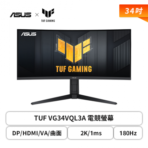【九成新福利品】【34型】華碩 TUF VG34VQL3A 電競螢幕 (DP/HDMI/VA/曲面/2K/1ms/180Hz/FreeSync Premium Pro/HDR400/可升降/內建喇叭/三年保固)