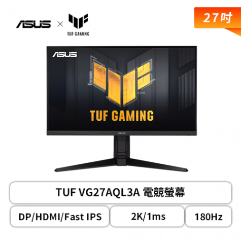 【九成新福利品】【27型】華碩 TUF VG27AQL3A 電競螢幕 (DP/HDMI/Fast IPS/2K/1ms/180Hz/Freesync Premium/G-Sync/HDR400/可變超頻驅動/130% sRGB/可升降/可旋轉/內建喇叭/三年保固)【福利品出清】