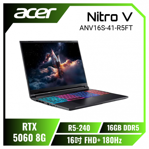 Ryzen處理器+RTX5060 acer Nitro V ANV16S-41-R5FT 宏碁戰魂電競遊戲筆電/R5-240/RTX5060 8G/16GB DDR5/512GB PCIe/16吋 FHD+ 180Hz/W11/含原廠包包及滑鼠