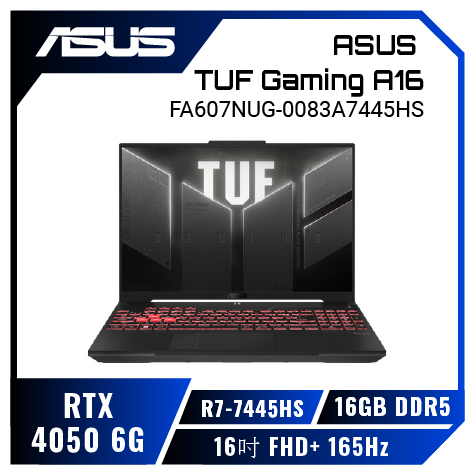強效AMD★滿血RTX4050 ASUS TUF Gaming A16 FA607NUG-0083A7445HS 鐵甲灰 華碩薄邊框軍規電競筆電/R7-7445HS/RTX4050 6G/16GB DDR5/512GB PCIe/16吋 16:10 FHD+ 165Hz/W11/含TUF電競滑鼠
