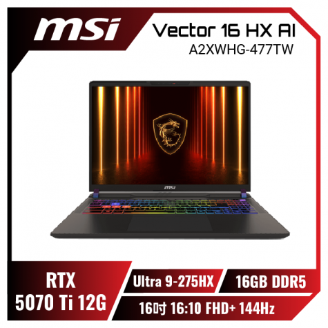 24核心處理器★RTX5070Ti滿血顯卡 MSI Vector 16 HX AI A2XWHG-477TW 微星滿血版電競筆電/Ultra 9-275HX/RTX5070Ti 12G/16GB DDR5/1TB PCIe/16吋 16:10 FHD+ 144Hz/W11/SS單鍵RGB背光電競鍵盤