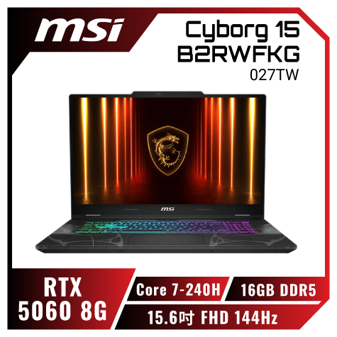 新一代高效處理器★RTX5060 MSI Cyborg 15 B2RWFKG-027TW 微星輕薄戰鬥電競筆電/Core 7-240H/RTX5060 8G/16GB DDR5/512GB PCIe/15.6吋 FHD 144Hz/W11/四區RGB鍵盤背光