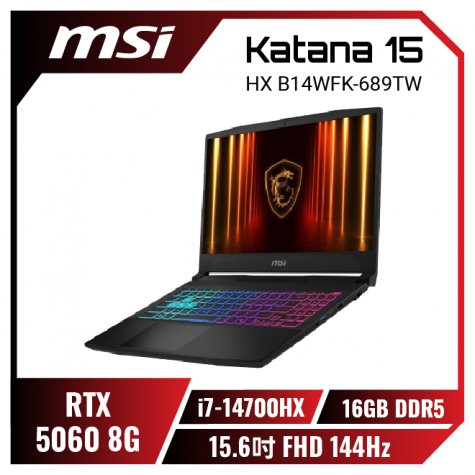超頻處理器★強效RTX5060 MSI Katana 15 HX B14WFK-689TW 微星炫彩戰鬥款電競筆電/i7-14700HX/RTX5060 8G/16GB DDR5/1TB PCIe/15.6吋 FHD 144Hz/W11/四區RGB背光電競鍵盤