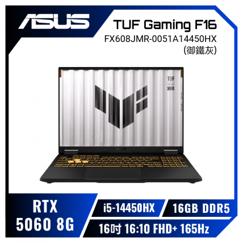 14代超頻HX處理器★RTX5060 ASUS TUF Gaming F16 FX608JMR-0051A14450HX 御鐵灰 華碩14代軍規電競筆電/i5-14450HX/RTX5060 8G/16GB DDR5/512GB PCIe/16吋 16:10 FHD+ 165Hz/W11/含TUF電競滑鼠