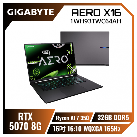 Ryzen★RTX5070 GIGABYTE AERO X16 1WH93TWC64AH 太空灰 技嘉輕薄電競AI筆電/Ryzen AI 7 350/RTX5070 8G/32GB DDR5/1TB PCIe/16吋 16:10 WQXGA 165Hz/W11