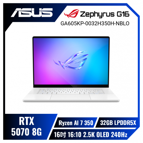 全新AI PC滿血出擊 ASUS ROG Zephyrus G16 GA605KP-0032H350H-NBLO 鉑月銀 華碩西風之神輕薄電競AI筆電/Ryzen AI 7 350/RTX5070 8G/32GB LPDDR5X/2TB PCIe/16吋 16:10 2.5K OLED 240Hz/W11/含ROG保護套+電競滑鼠
