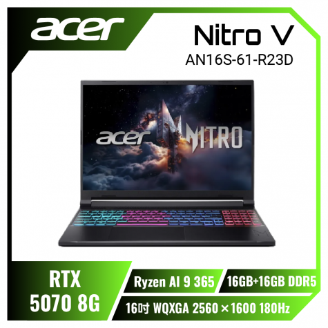 Ryzen AI 9+RTX5070 acer Nitro V AN16S-61-R23D 宏碁戰魂電競遊戲筆電/Ryzen AI 9 365/RTX5070 8G/32GB DDR5/1TB PCIe/16吋 16:10 2.5K 180Hz/W11/含原廠包包及滑鼠