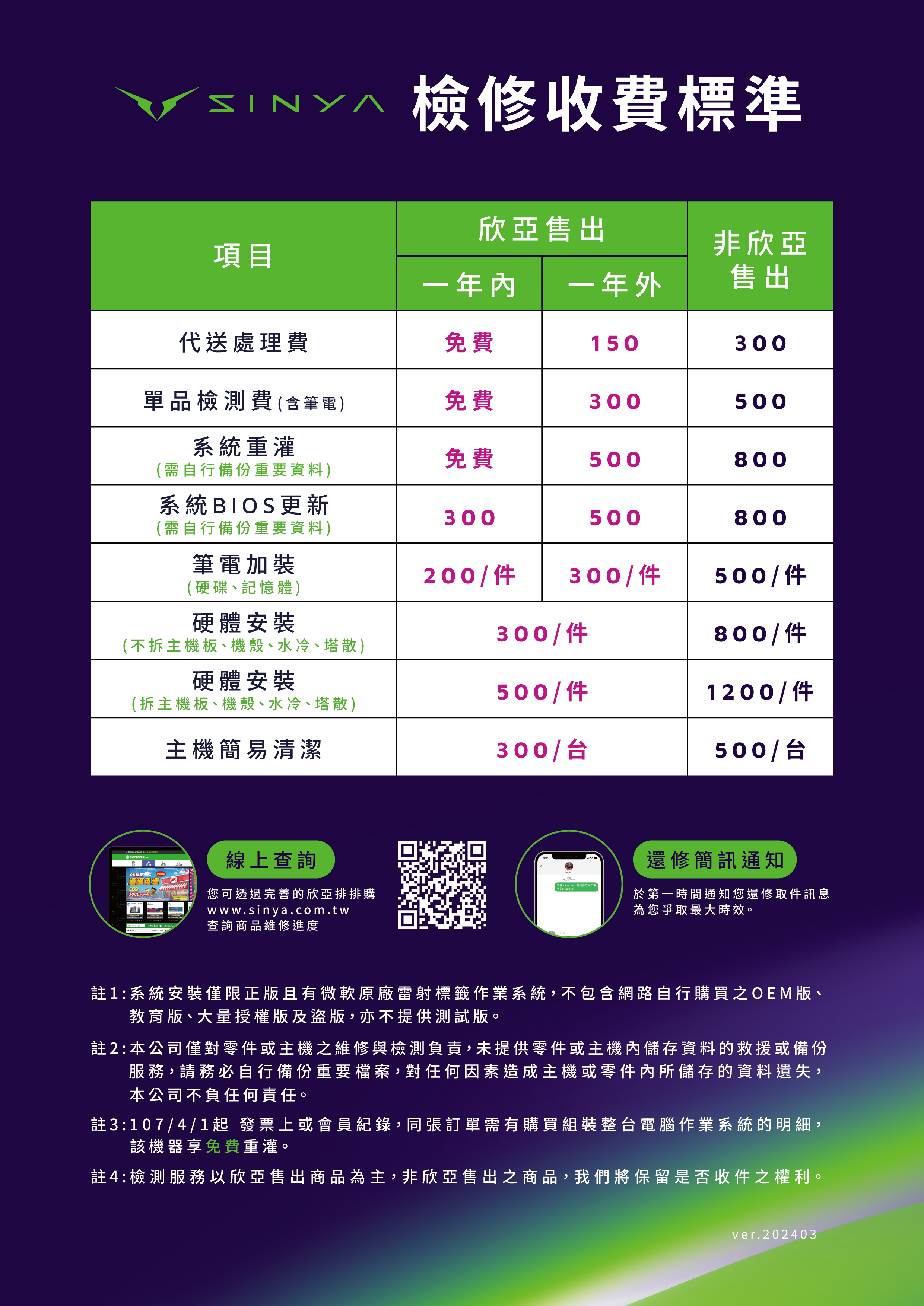 • 商品送修時,若您是向欣亞購買之商品,售出日期一年內我們將提供商品免費代送之服務(除人為損壞及其他因素廠商有報價)。 若您購買商品已超過一年,我們將酌收部分費用。 若商品有外觀異常,非自然損壞之情況,我們可協助報修代理商或原廠做鑑定報價。