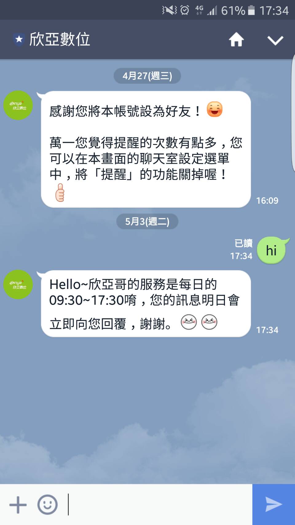 即日起,只要透過LINE@加入欣亞客服小天使,就可以透過手機、平板隨時隨地尋求欣亞數位的協助喔!目前欣亞客服小天使的服務時段為: