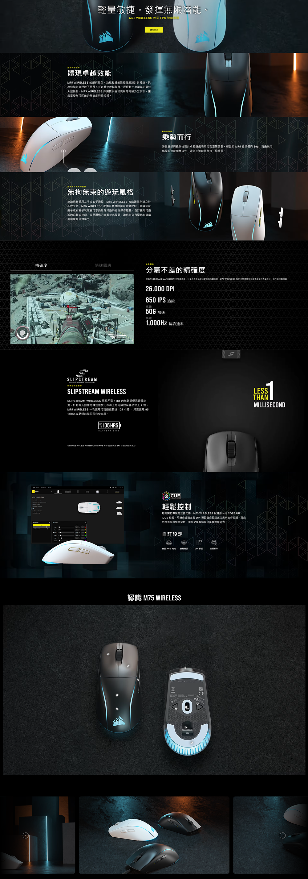 乘勢而上乘势而上:在高水準的遊戲性能中,滑鼠的重量和可操作性至關重要。 M75 WIRELESS重89g,輕巧自如,操作滑鼠時速度非凡,精準度卓越。