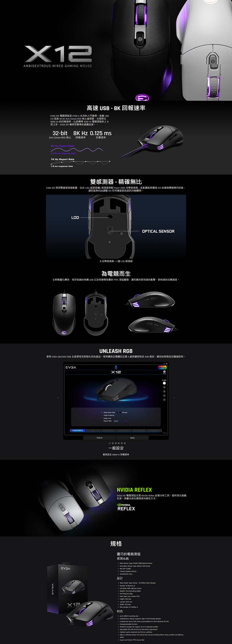 戲鼠標,8k,有線,黑色,可定制,雙傳感器,16,000 DPI,5 個配置文件,8 個按鈕,靈巧輕便