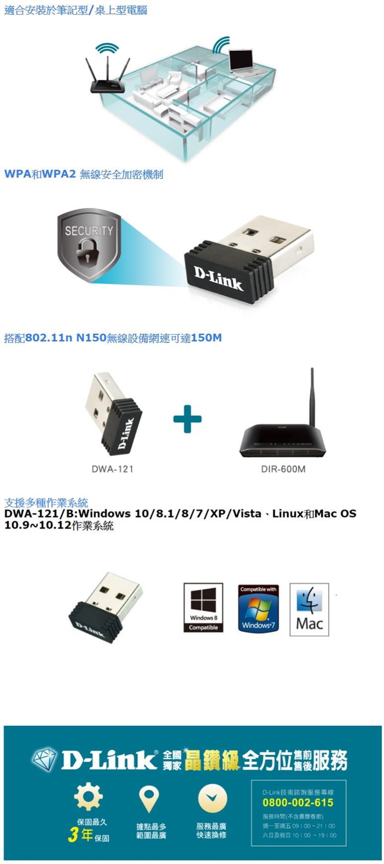 ★ 具備USB (USB 2.0) 介面適合安裝於筆記型/桌上型電腦 ★ 符合IEEE 802.11n 無線標準,可向下相容於802.11b/g 無線設備 ★ 採用 1T1R天線設計最高無線傳輸速率可達150Mbps ★ 提供強大的64/128 bit WEP, WPA, WPA2 無線安全加密機制 ★ 支援WPS Wi-Fi 無線安全設定,方便無線網路連線 ★ 設定容易,隨插即用 ★ 支援 Windows XP/Vista/7 等作業系統 ★ 搭配D-Link 11N 系列無線寬頻路由器最高傳速率可達150Mbps。 ★ 迷你外型方便攜帶不佔空間:18.6x14.3x6.1 mm