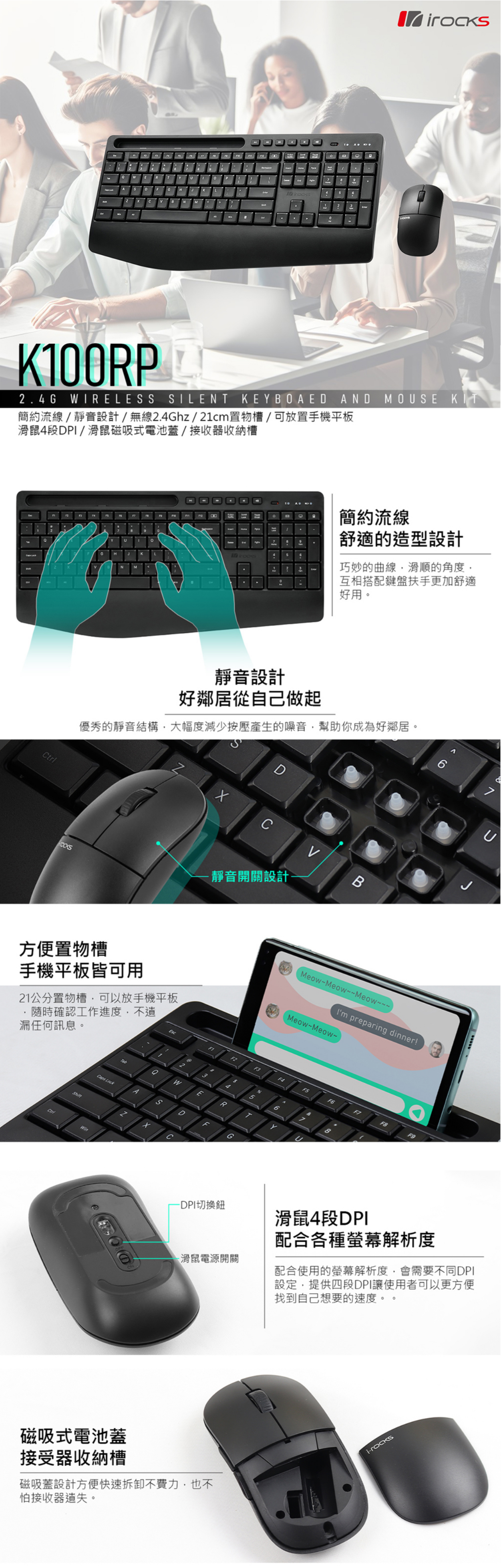 • 滑鼠跟鍵盤按鍵採用靜音設計,使用安靜、舒適,適於安靜環境使用。