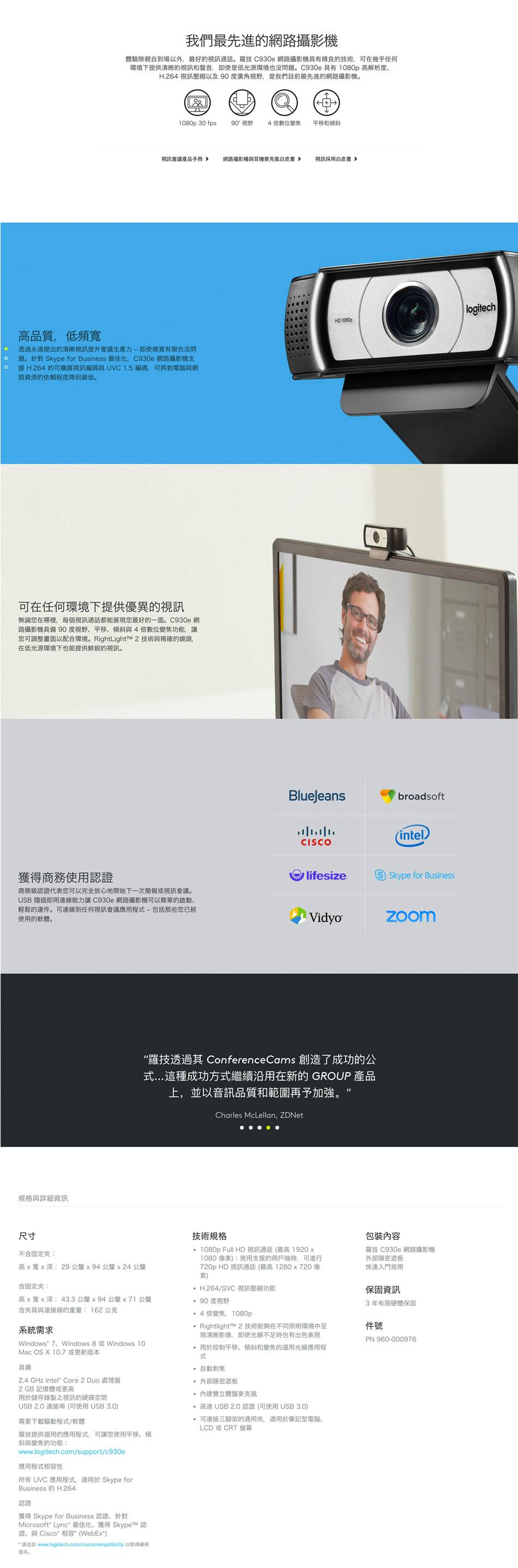 高清 1080p 畫質 (30 fps) 支援羅技 RightLight 技術和自動對焦 4倍數字縮放,全高清 畫面平移、傾斜和變焦選項 卡爾.蔡司玻璃鏡頭 即插即用USB連接