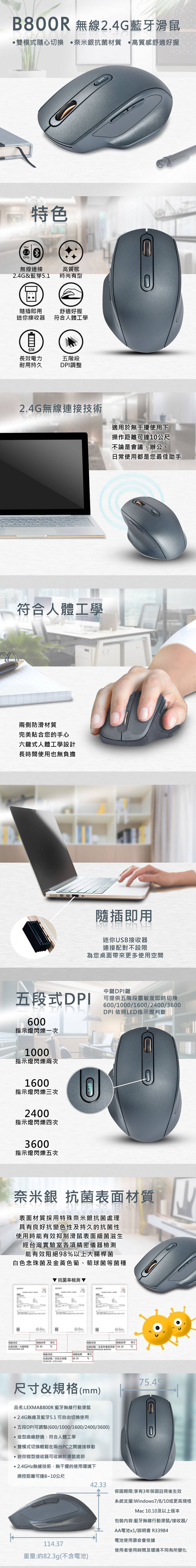 •2.4G無線及藍牙可自由切換使用1600 DPI設計,五鍵式設計