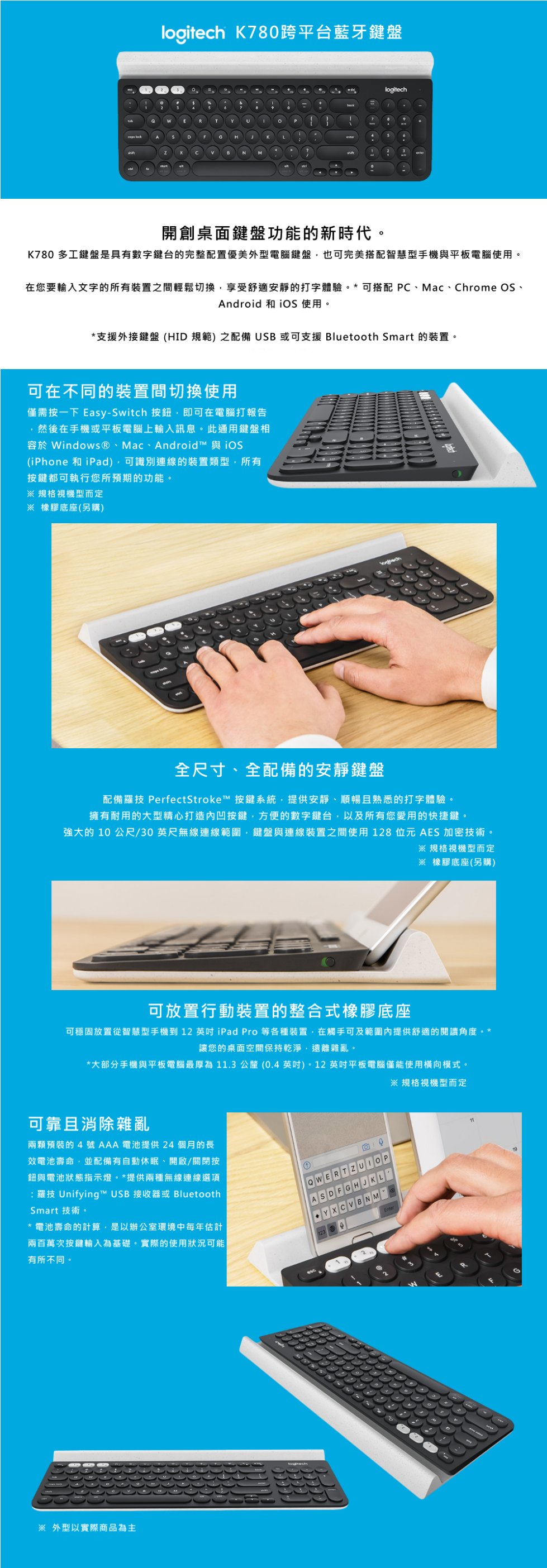 整合式手機與平板電腦立架 無線範圍可達10公尺 在裝置間輕鬆切換 安靜舒適的打字體驗