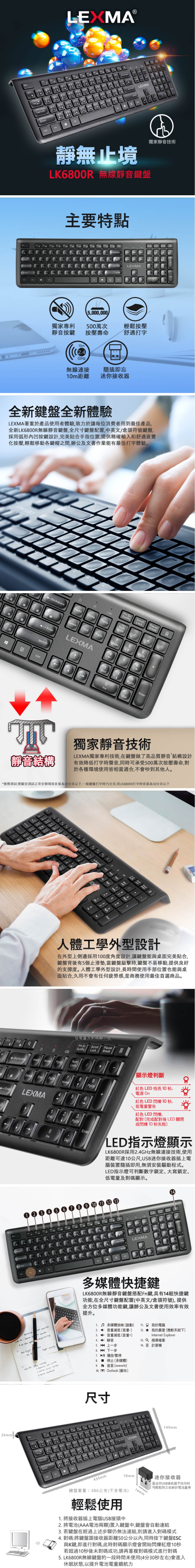 產品特色 ●全尺寸標準按鍵配置,中英文/倉頡符號鍵盤 ●專利高品質的靜音按鍵,五百萬次的敲擊壽命 ●人體工學外型設計,商務使用首選 ●弧形內凹按鍵,提供精確輸入和舒適的打字體驗 ●USB接收器即插即用,無需安裝驅動軟體
