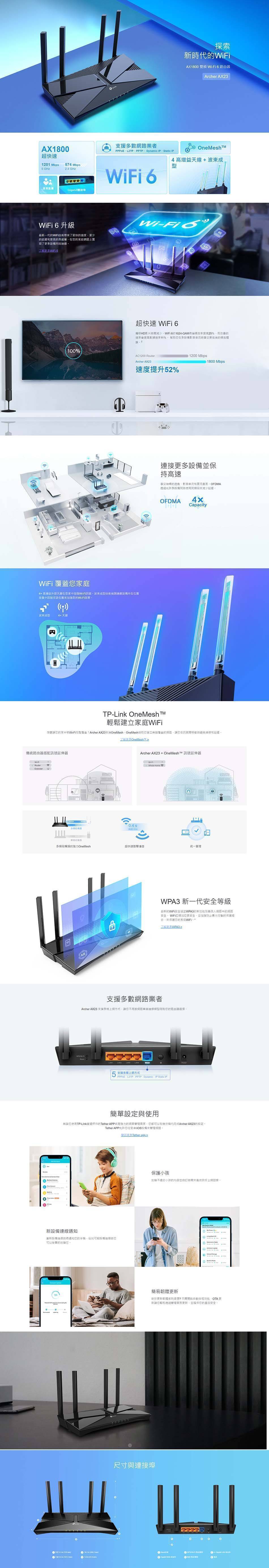 超快1.8 Gbps Wi-Fi – 1.8 Gbps的超快Wi-Fi速度讓您享受流暢的4K影音串流和下載。† 連接更多設備 – 使用OFDMA技術與更多設備通訊,同時降低延遲。‡ 更廣的覆蓋範圍: 透過改進的演算法,波束成形和高效能天線增強了Wi-Fi覆蓋範圍。§ 次世代平台 – 新一代高效晶片提供高速穩定的Wi-Fi同時降低功耗。△ 家長監護 – 享受所有路由器中最多功能的家長控制功能,包括網址封鎖,設定檔案管理,暫停等。 適用於多數網路業者 – 適用於絕大多數網路業者線路,且支援IPTV功能(MOD)。 OneMesh – 搭配OneMesh訊號延伸器讓Wi-Fi完整覆蓋您家範圍並享受順暢的漫遊訊號。 輕鬆設定– 使用功能強大的Tether App,可在幾分鐘內將路由器設定完成。 向下相容– 支援使用過去802.11標準的Wi-Fi設備。
