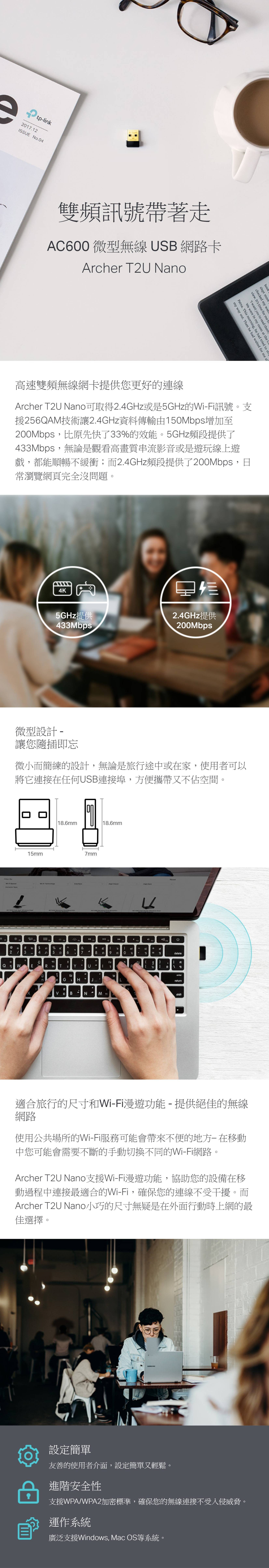 TP-Link Archer T2U Nano 雙頻USB無線網卡/AC600/雙頻/體積小巧連線速度高/三年保固