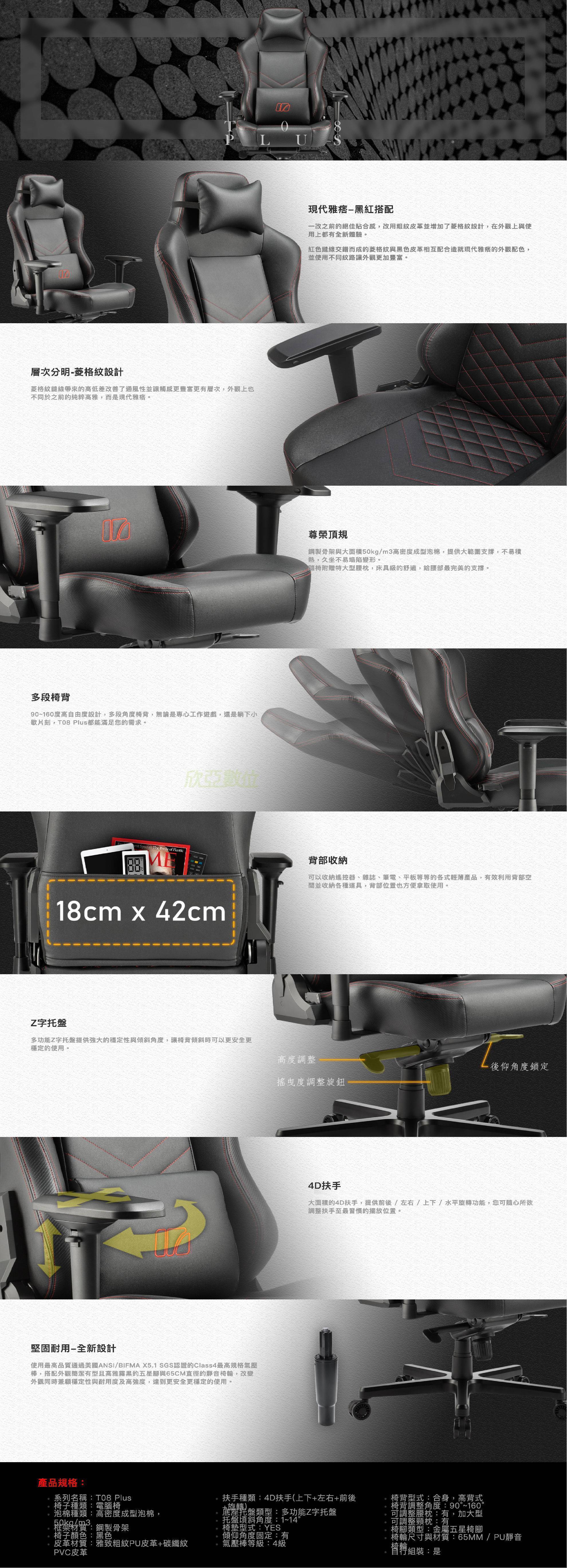 irocks T08 PLUS 高階電腦椅/四級氣壓棒/65mm訂製靜音輪/多功能Z字托盤、進階五星椅爪