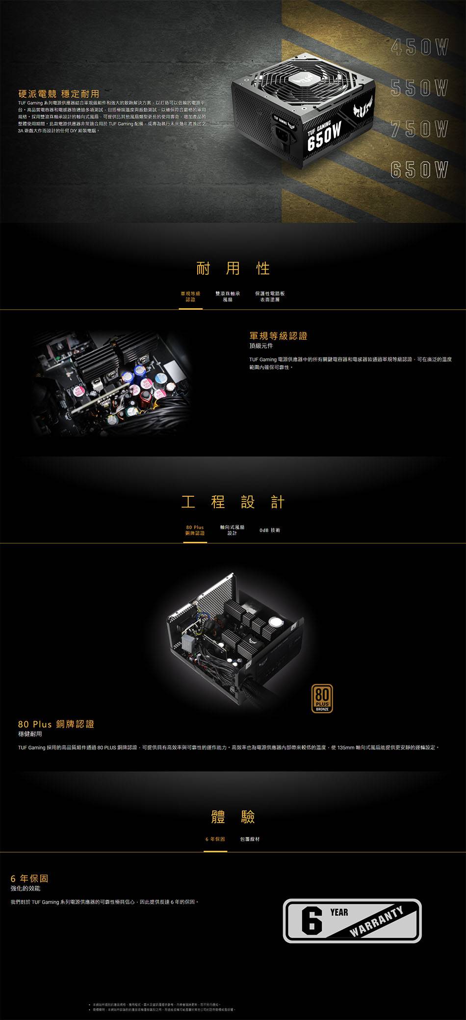 華碩 TUF GAMING 650W (80+銅牌/ATX/雙滾珠風扇/智慧停轉/防潮塗層/直出/六年保固)