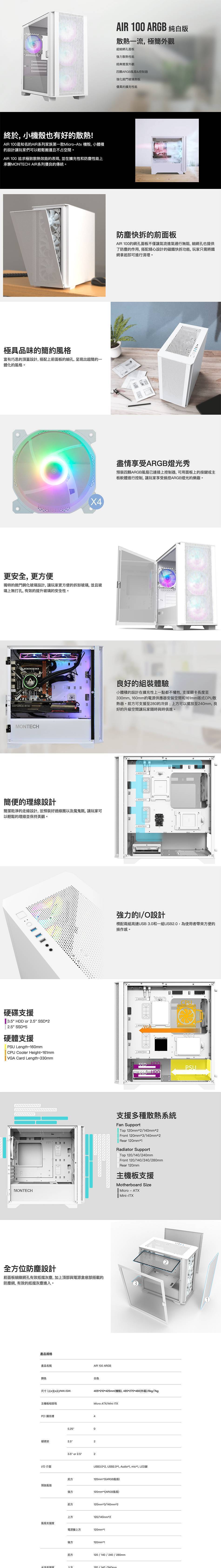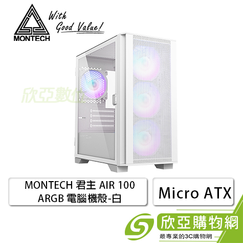 MONTECH AIR 100 ARGB 白 玻璃透側機殼 (M-ATX/內建ARGB風扇前3後1/顯卡330mm/塔散161mm)