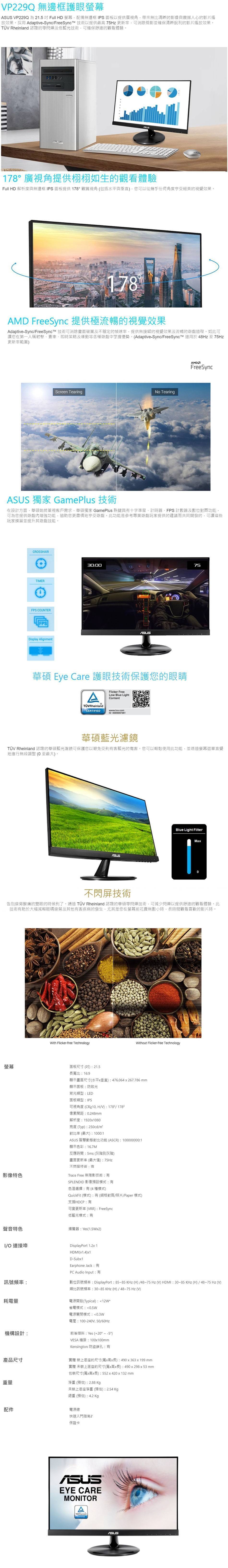 【22型】華碩 VP229Q 液晶螢幕 (DP/HDMI/D-Sub/IPS/5ms/75Hz/Adaptive-Sync/不閃屏/低藍光/內建喇叭/三年保固)