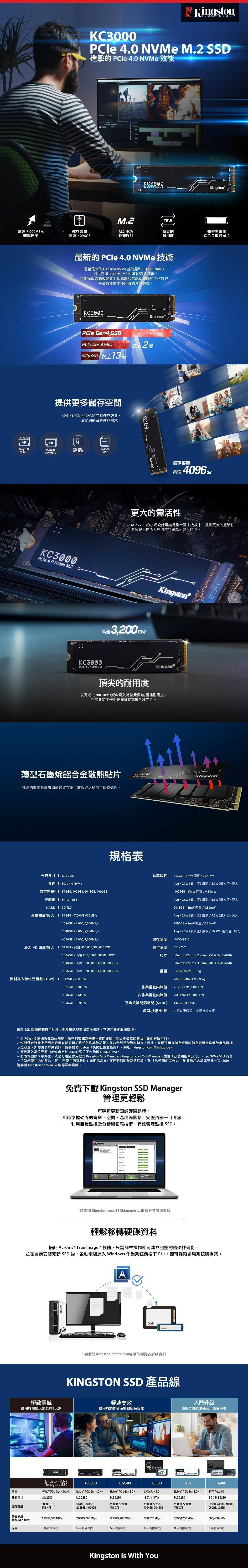 金士頓 Kingston KC3000 2TB/M.2 PCIe Gen4/讀:7000M/寫:7000M/TLC/五年保