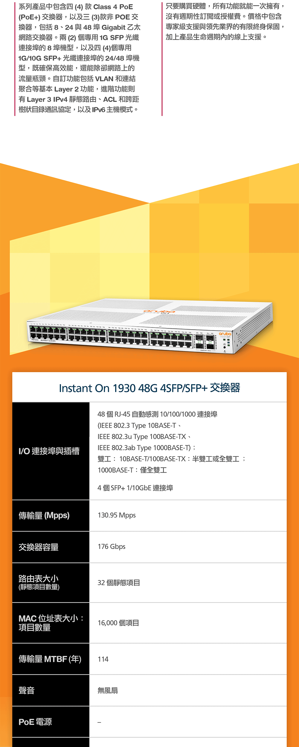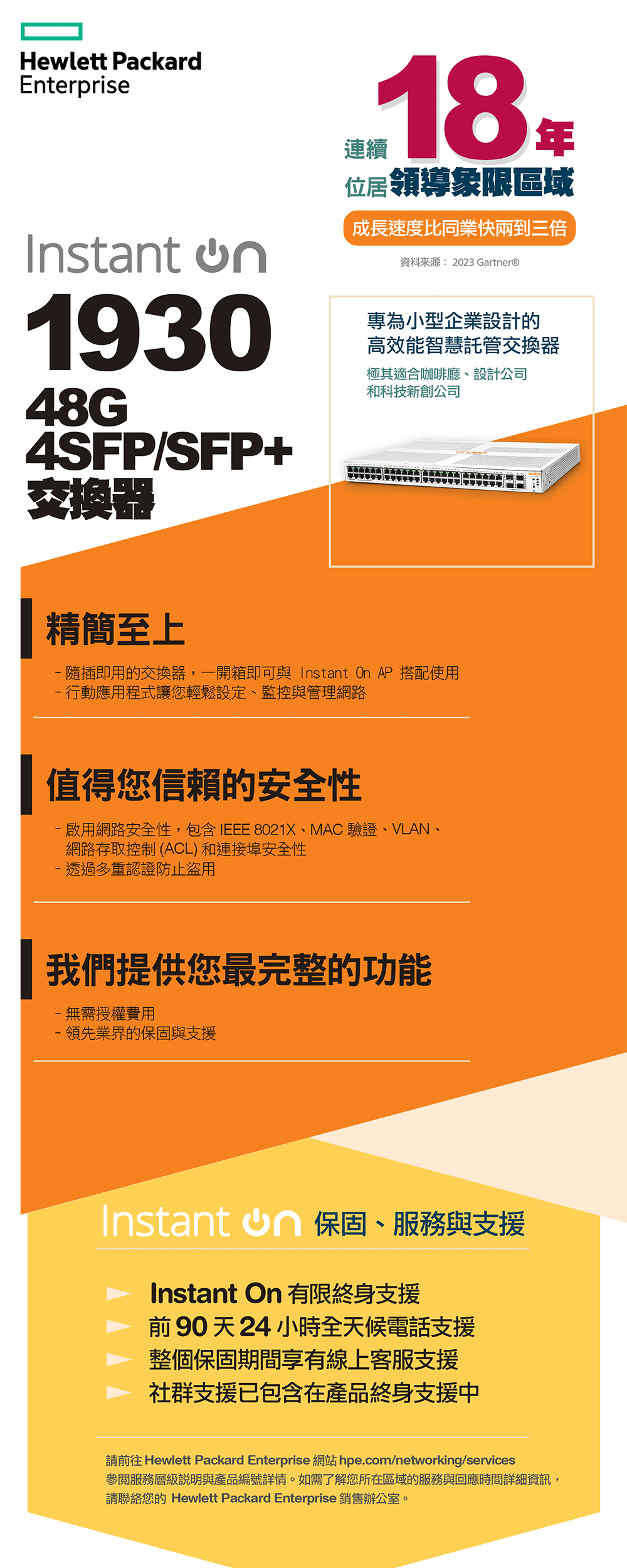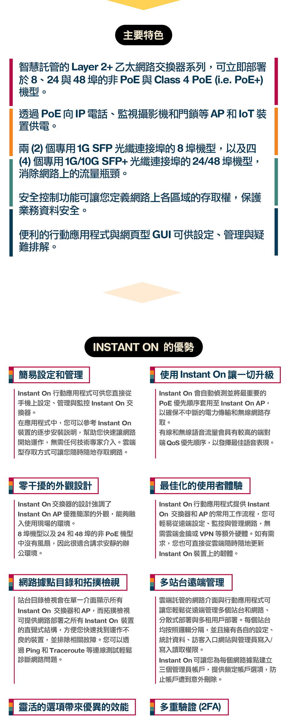 - 隨插即用的交換器,一開箱即可與 Instant OnAP 搭配使用