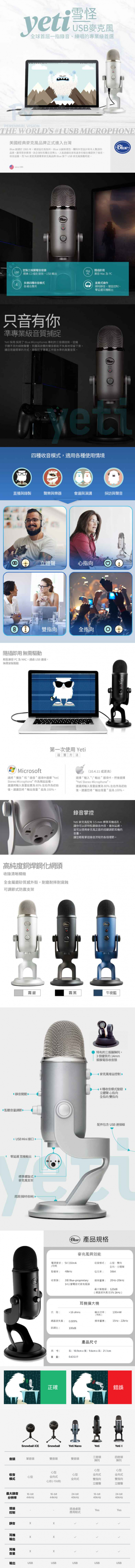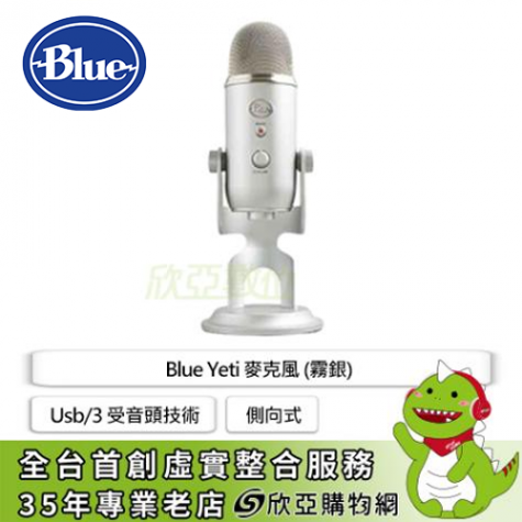 Blue Yeti 麥克風 (霧銀)/Usb/3 受音頭技術/心型、雙向、全向、立體聲模式/側向式