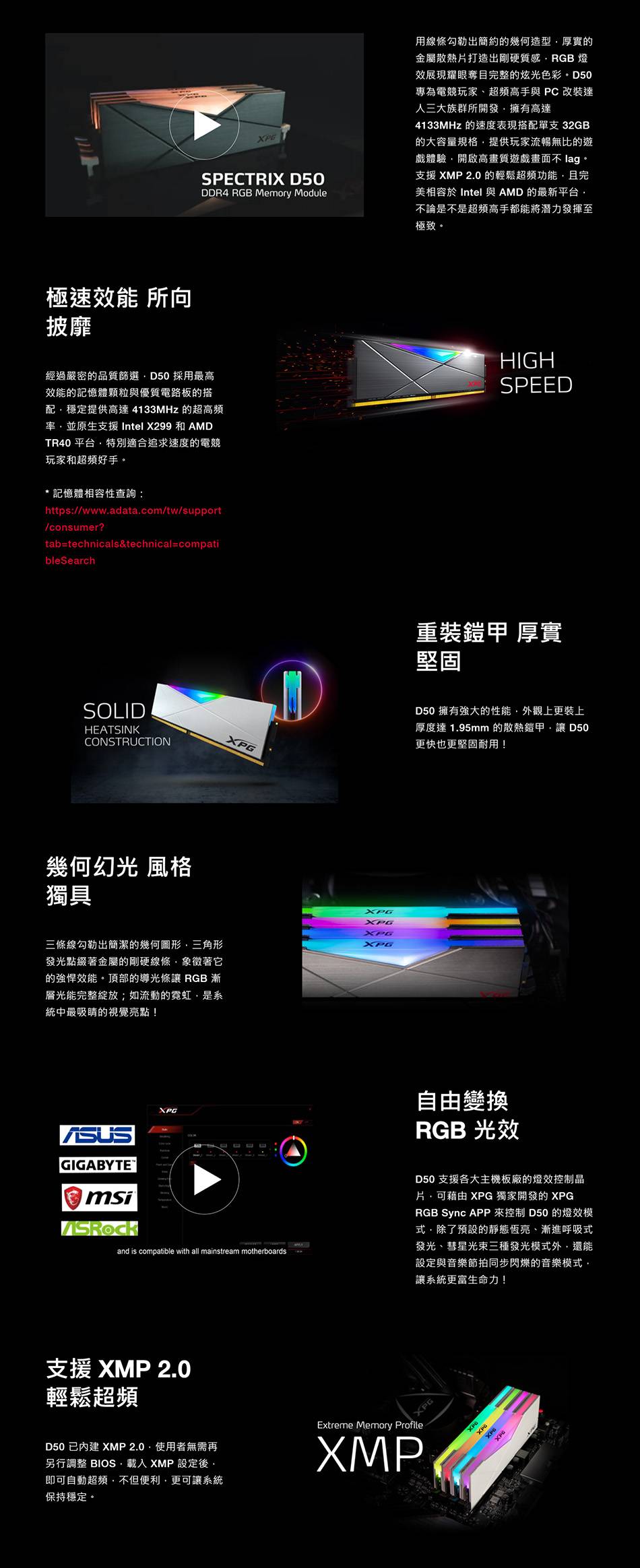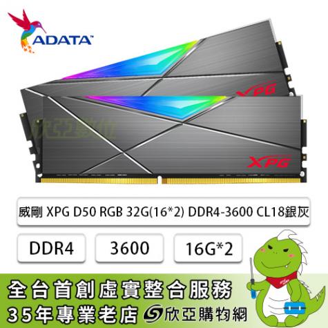 威剛 XPG D50 RGB DDR4-3600 32G(16G*2)-銀灰(CL18)