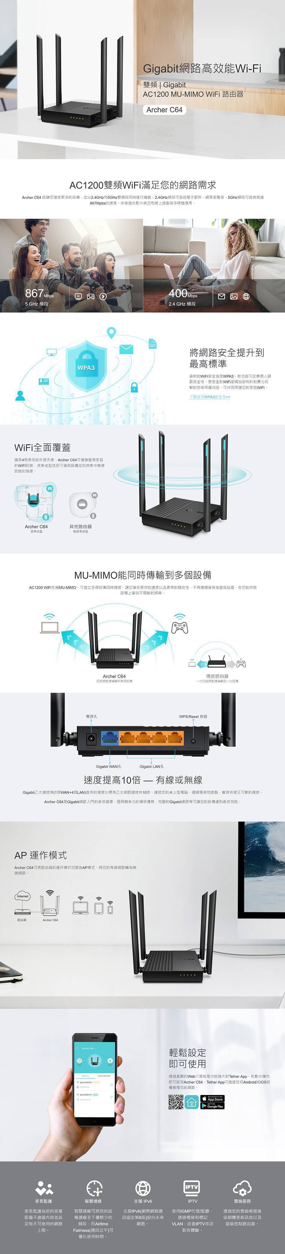 802.11ac Wave2 WiFi – 867 Mbps(5GHz頻段)和400 Mbps(2.4 GHz頻段)。 提升WiFi覆蓋範圍 – 4個外接天線可提供穩定的無線連接和最佳的覆蓋範圍。 MU-MIMO – 藉由TP-Link Tether App讓您輕鬆實現網路管理,MU-MIMO可同時2台設備通訊,提升2倍效率。 波束成型 – 波束成型技術可提供強效的無線連接。 AP 模式 – 支援AP模式,可建立新的WiFi連接。 智慧連線 – 智慧連線可引導用戶到不擁塞的頻段和通訊公平優化時間使用。 輕鬆設定 – 透過TP-Link Tether APP輕鬆實現網路管理。