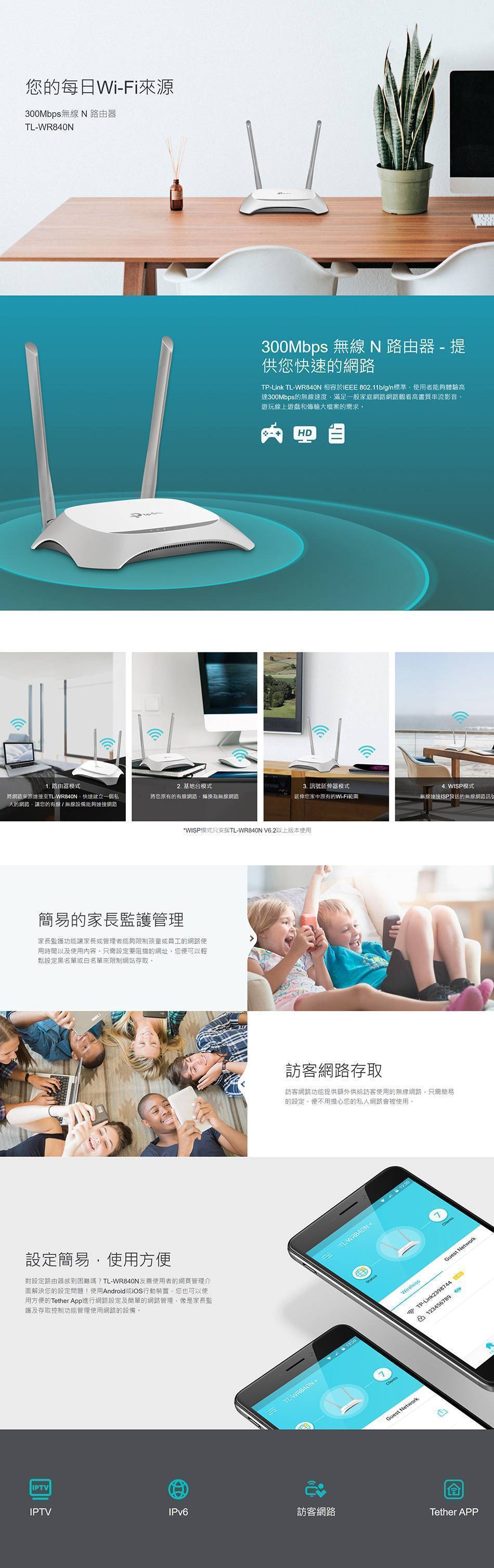 300Mbps無線網路傳輸,適合個人、家庭網路使用。 支援基地台模式,您可以建立自己的無線基地台。 支援訊號延伸器模式,能增強您原有的無線訊號範圍。 家長監護功能管理連接至路由器的設備能上網的時間及能使用的網站。 IPTV功能支援IGMP代理/監聽、橋接以及Tag VLAN來自訂IPTV串流(MOD)。 相容IPv4及IPv6(網際網路協定第6版)。 訪客網路提供額外的無線網路給訪客使用,保障您家中網路的安全。