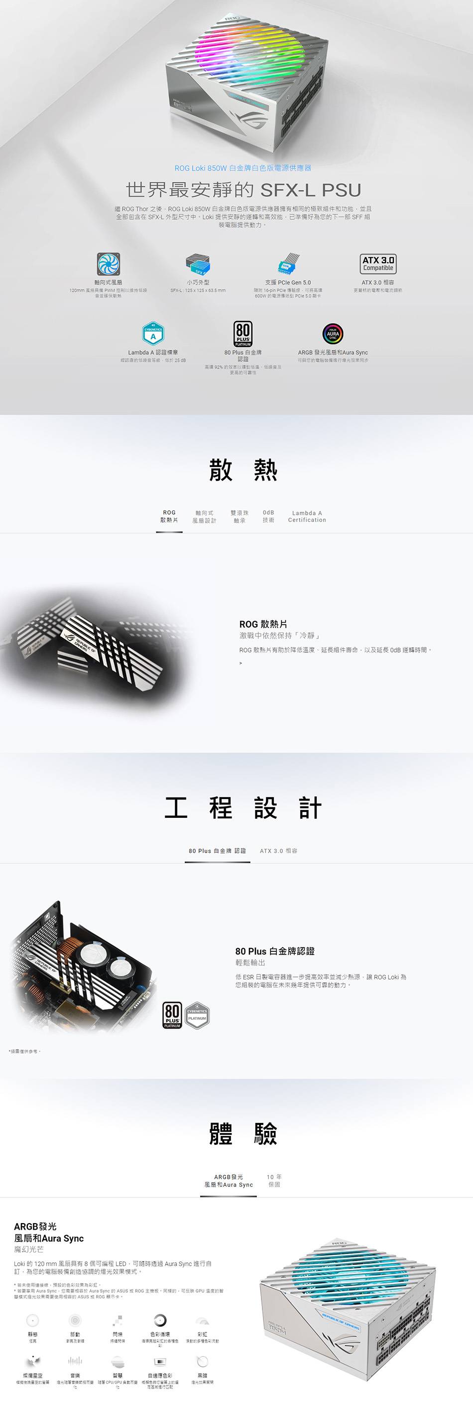華碩 ROG-LOKI 850W 白 (80+白金牌/附ATX轉接架/SFX-L/ATX3.0/PCIe 5.0/ARGB風扇/全模組/全日系/十年保固)