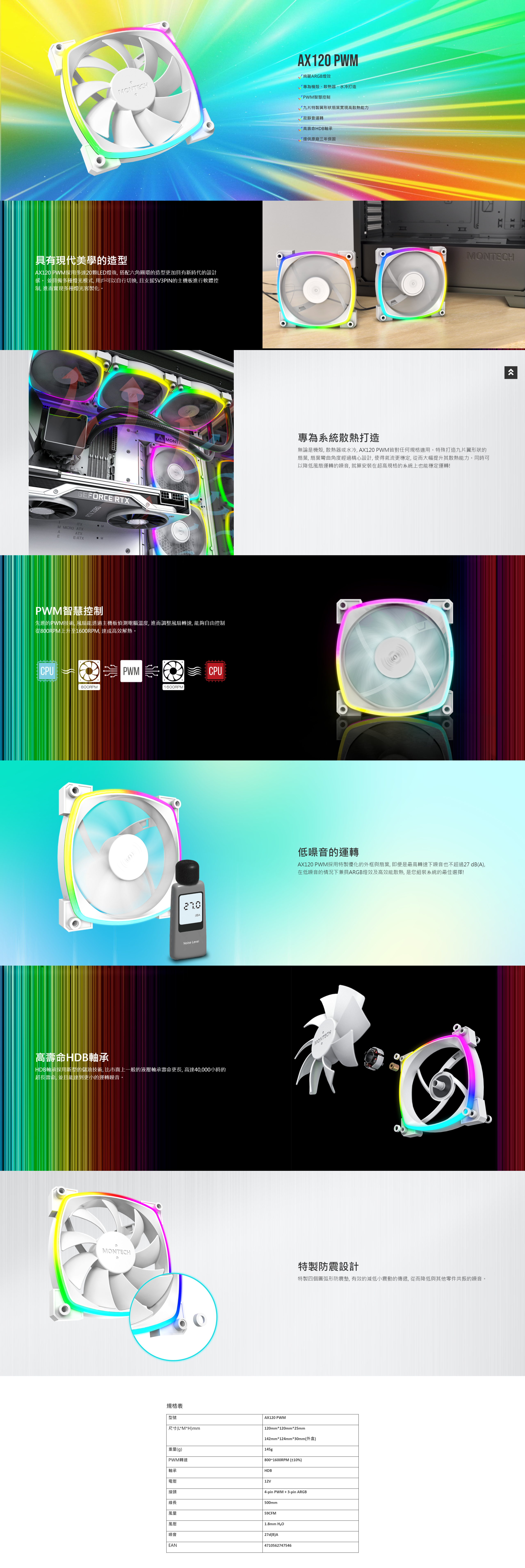 ▶絢麗ARGB燈效 ▶專為機殼、散熱器、水冷打造 ▶PWM智慧控制 ▶九片特製翼形狀扇葉實現高散熱能力 ▶寂靜音運轉 ▶高壽命HDB軸承 ▶提供原廠三年保固 查看原廠資訊