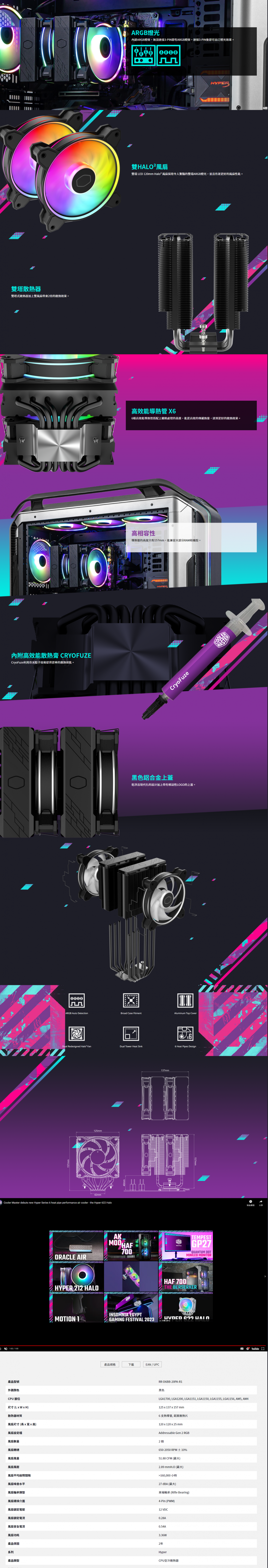 ▶ARGB燈光 ▶高相容性 ▶鋁合金上蓋 ▶全新設計的 Halo² 風扇 ▶6導熱管雙塔散熱器 原廠資訊