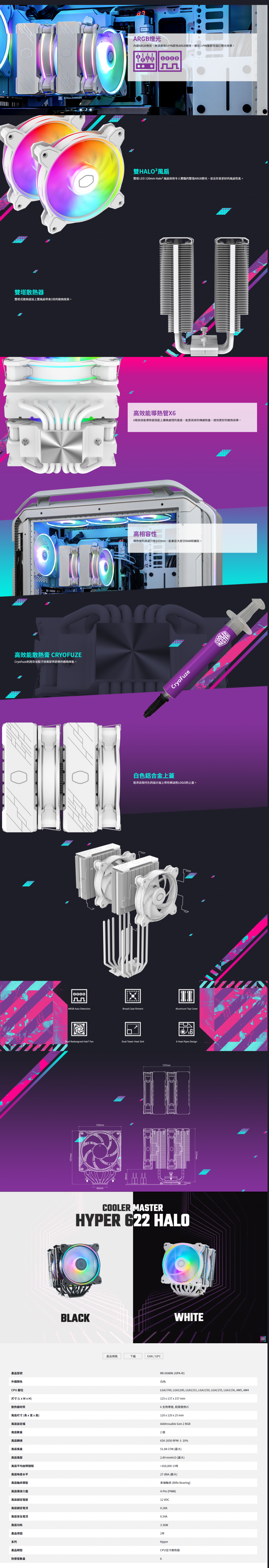 ▶ARGB燈光 ▶高相容性 ▶鋁合金上蓋 ▶全新設計的 Halo² 風扇 ▶6導熱管雙塔散熱器 原廠資訊
