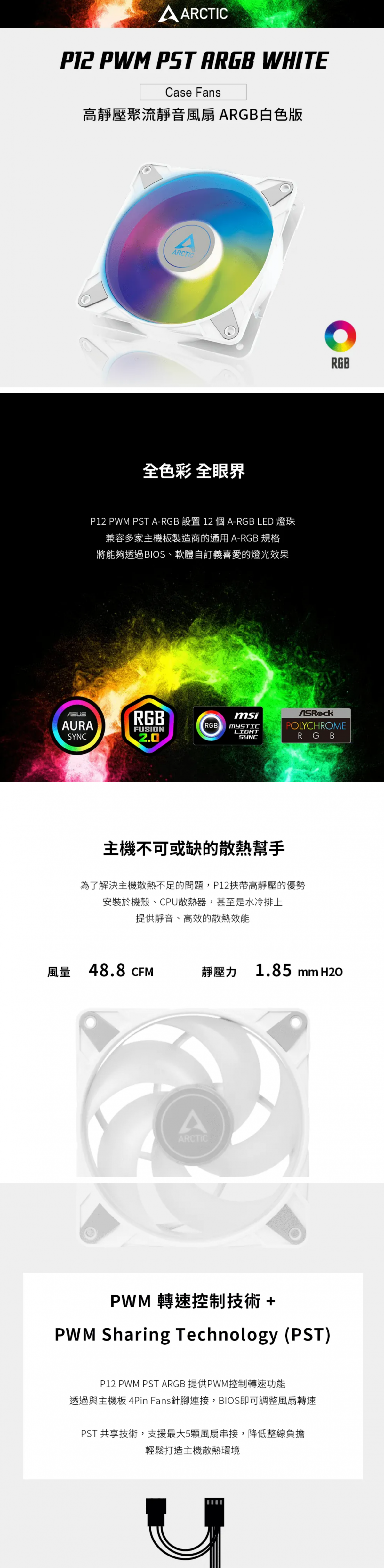 ▶搭載ARGB可尋址LED ▶針對靜壓力優化,提高散熱效能 ▶獨特葉扇設計,聚流效果最佳化 ▶新一代釹磁鐵硼馬達,節省功耗 ▶德國FDB液態軸承,極致靜音耐久壽命 ▶PWM Sharing Technology(PST)技術