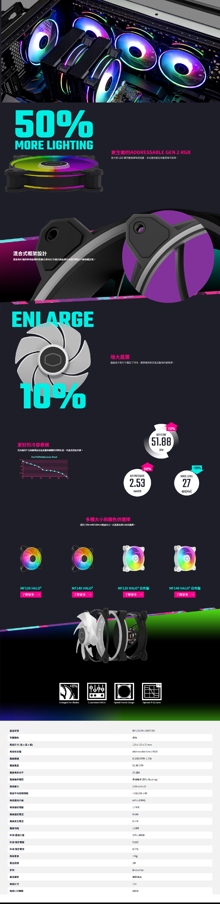 ▶增大扇葉 ▶混合式框架設計 ▶雙環ARGB燈效 ▶控制器優化 原廠資訊