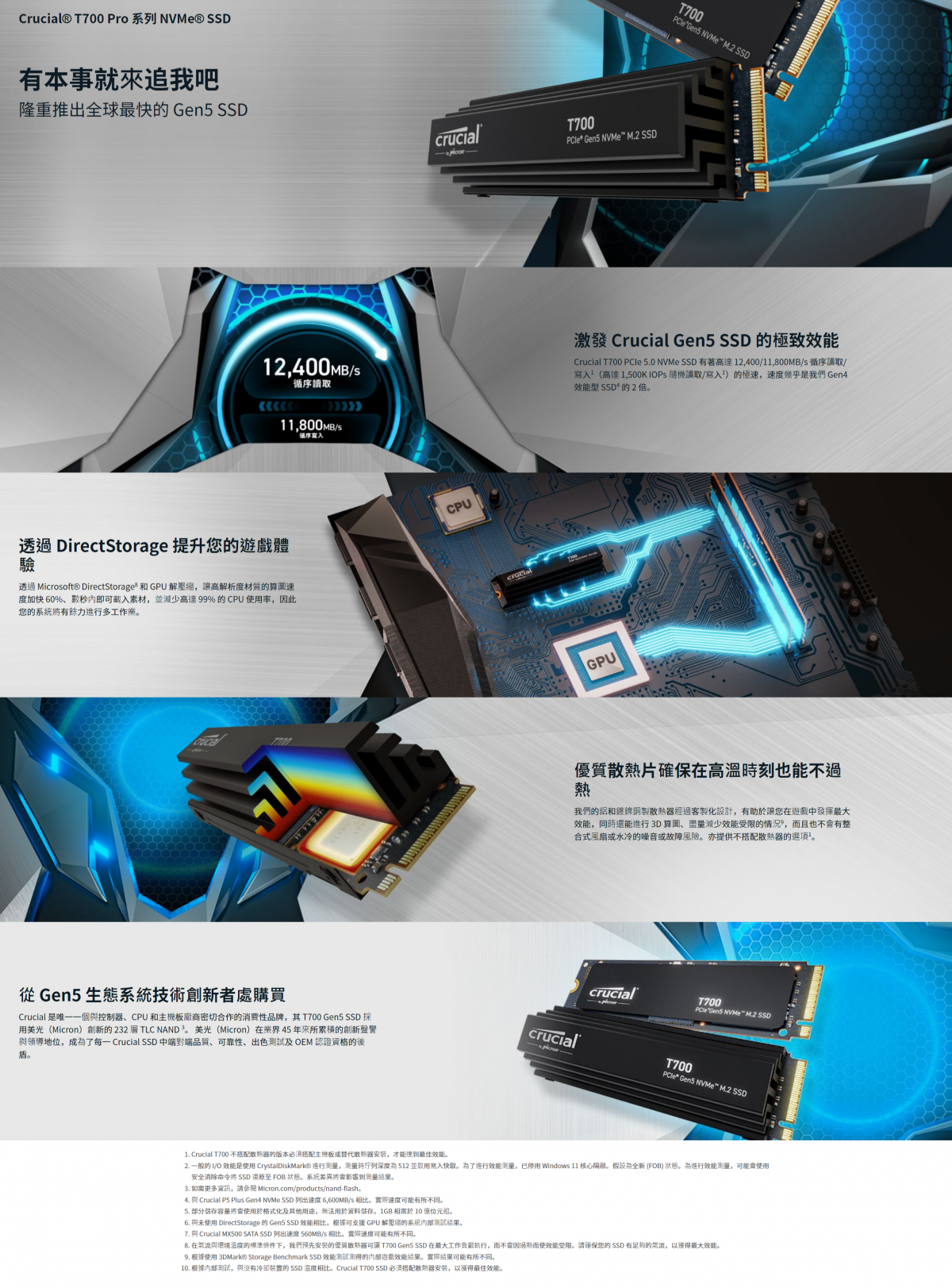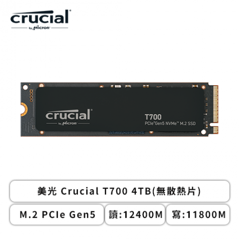 美光 Crucial T700 4TB(無散熱片)/M.2 PCIe Gen5/讀:12400M/寫:11800M/TLC/五年保
