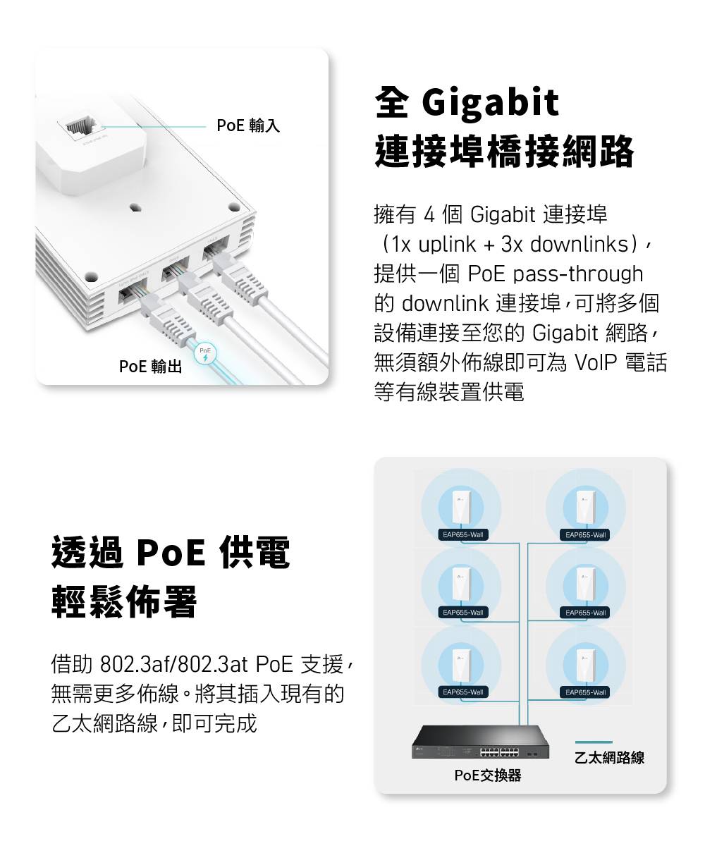 • 簡易安裝和支援802.3af/at PoE供電