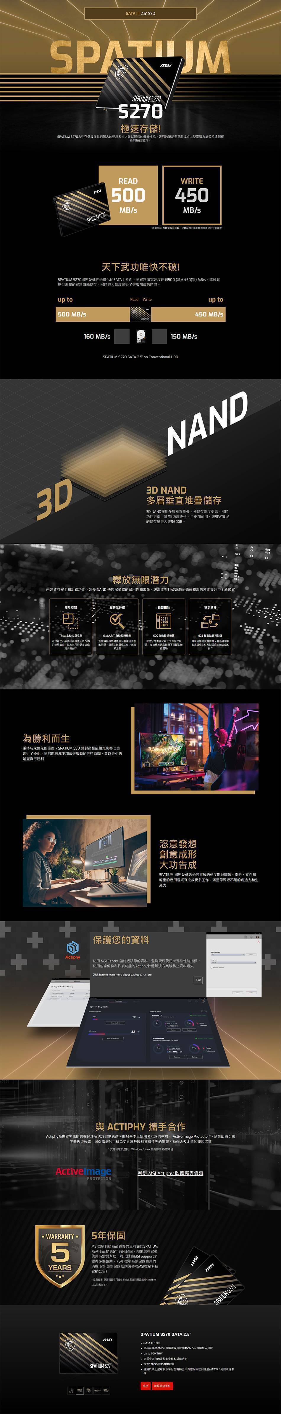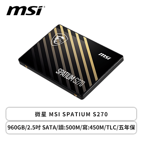 微星 MSI SPATIUM S270 960GB/2.5吋 SATA/讀:500M/寫:450M/TLC/五年保