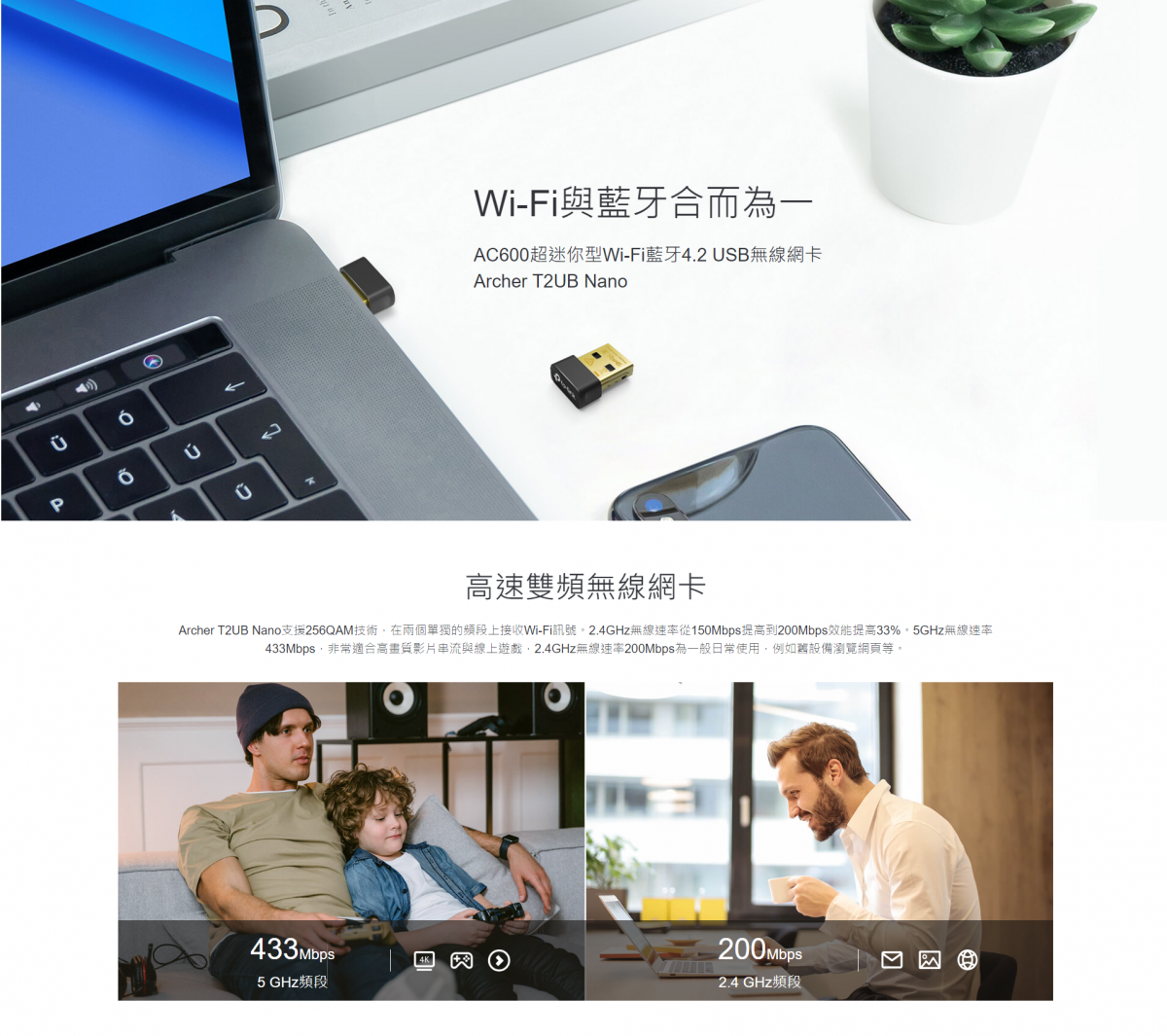 • 雙頻無線速度達AC600 (5GHz 433Mbps +2.4GHz 150Mbps)