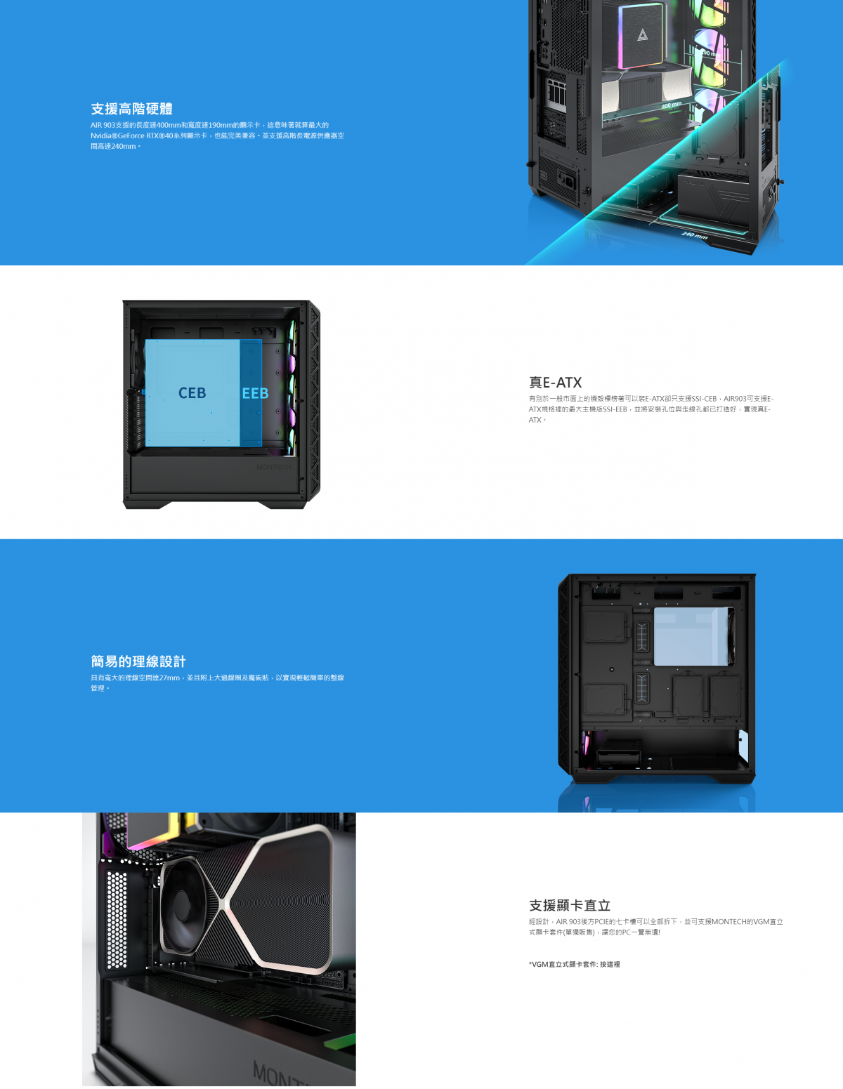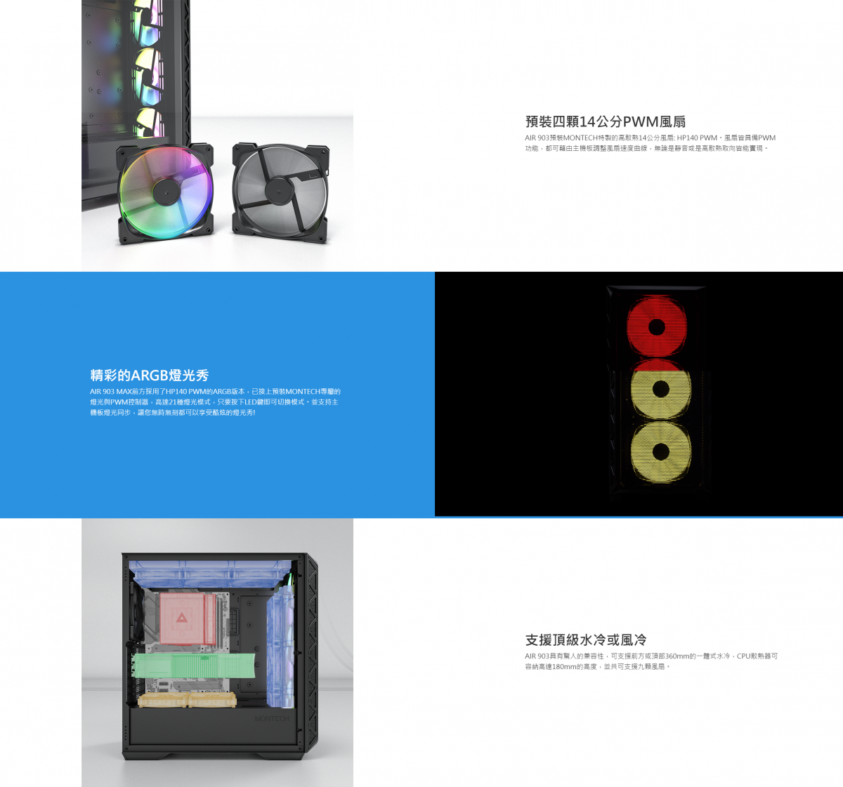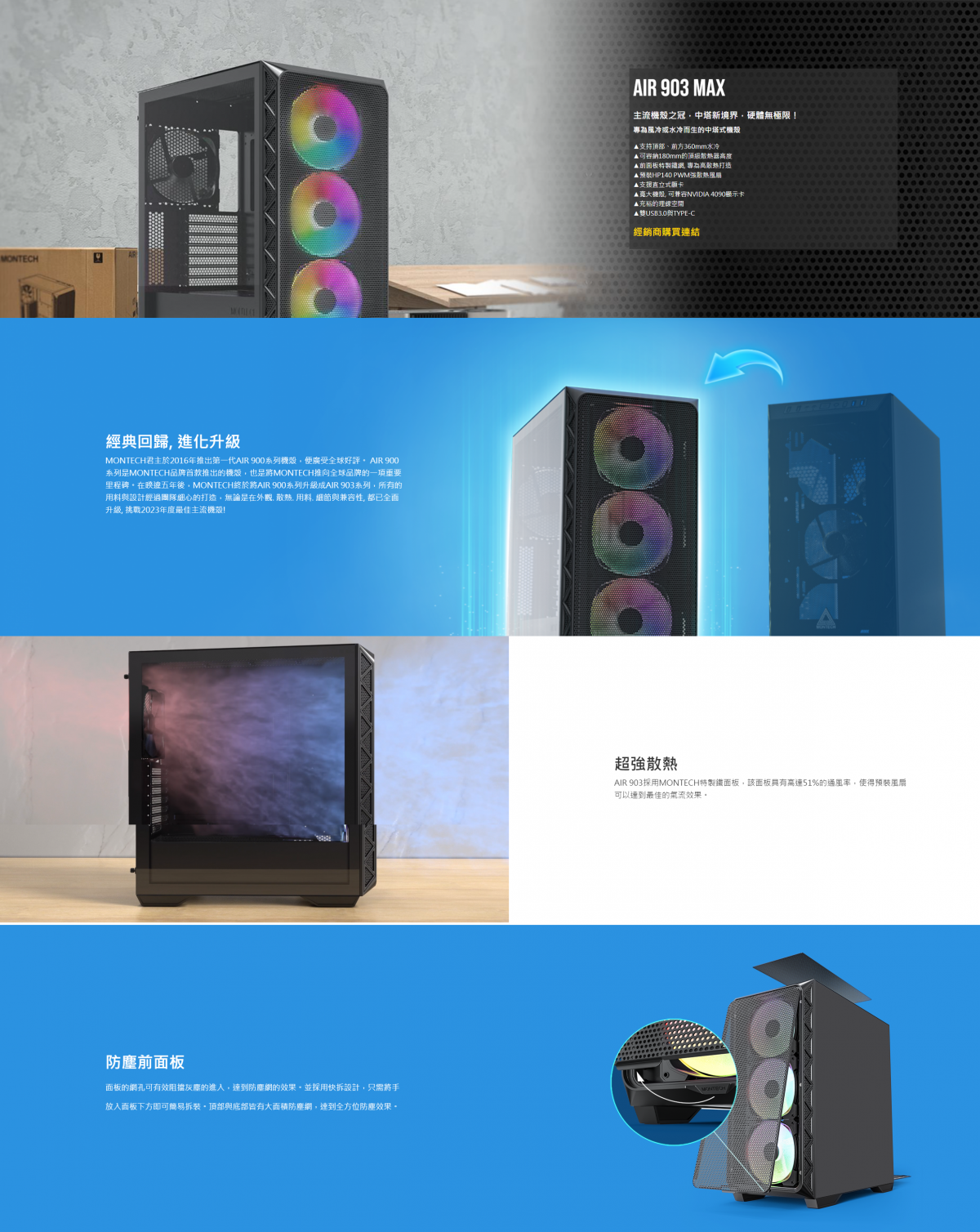 ▶支持頂部、前方360mm水冷 ▶可容納180mm的頂級散熱器高度 ▶前面板特製鐵網, 專為高散熱打造 ▶預裝HP140 PWM強散熱風扇 ▶支援直立式顯卡 ▶寬大機殼, 可兼容NVIDIA 4090顯示卡 ▶充裕的理線空間 ▶雙USB3.0與TYPE-C 查看原廠資訊